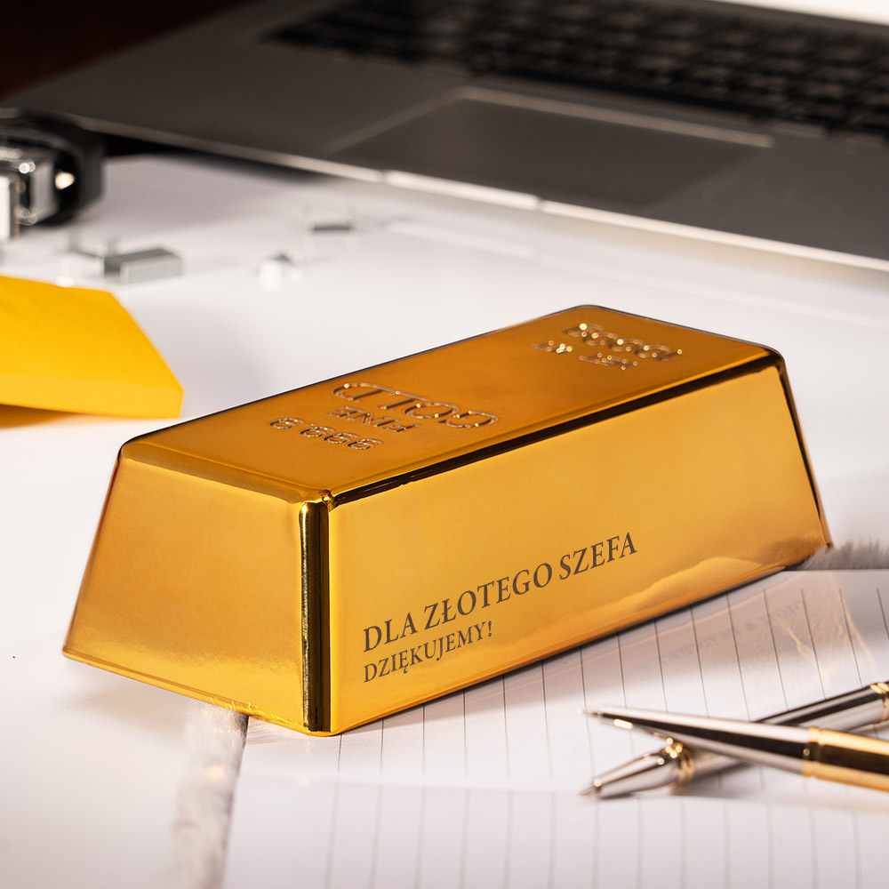 - Elegancka sztabka złota z grawerem „Dla Złotego Szefa. Dziękujemy!” to wyjątkowy prezent od zespołu – symbol uznania, wdzięczności i szacunku. Idealna na koniec roku, jubileusz lub firmowe podsumowania.