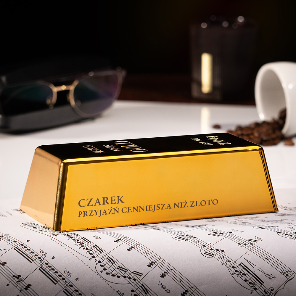 Personalizowana sztabka złota z grawerem imienia oraz dedykacją „Przyjaźń cenniejsza niż złoto” to oryginalny i pełen symboliki prezent, który podkreśla wyjątkową wartość relacji między dwiema osobami. Choć jest imitacją prawdziwego złota, jej wygląd zachwyca elegancją i sprawia, że prezentuje się niezwykle efektownie zarówno w domu, jak i w biurze. Sztabka złota to nie tylko stylowy, ale również praktyczny gadżet. Może pełnić rolę: przycisku do papieru, podpórki na telefon, dekoracji biurka, wyróżnienia.