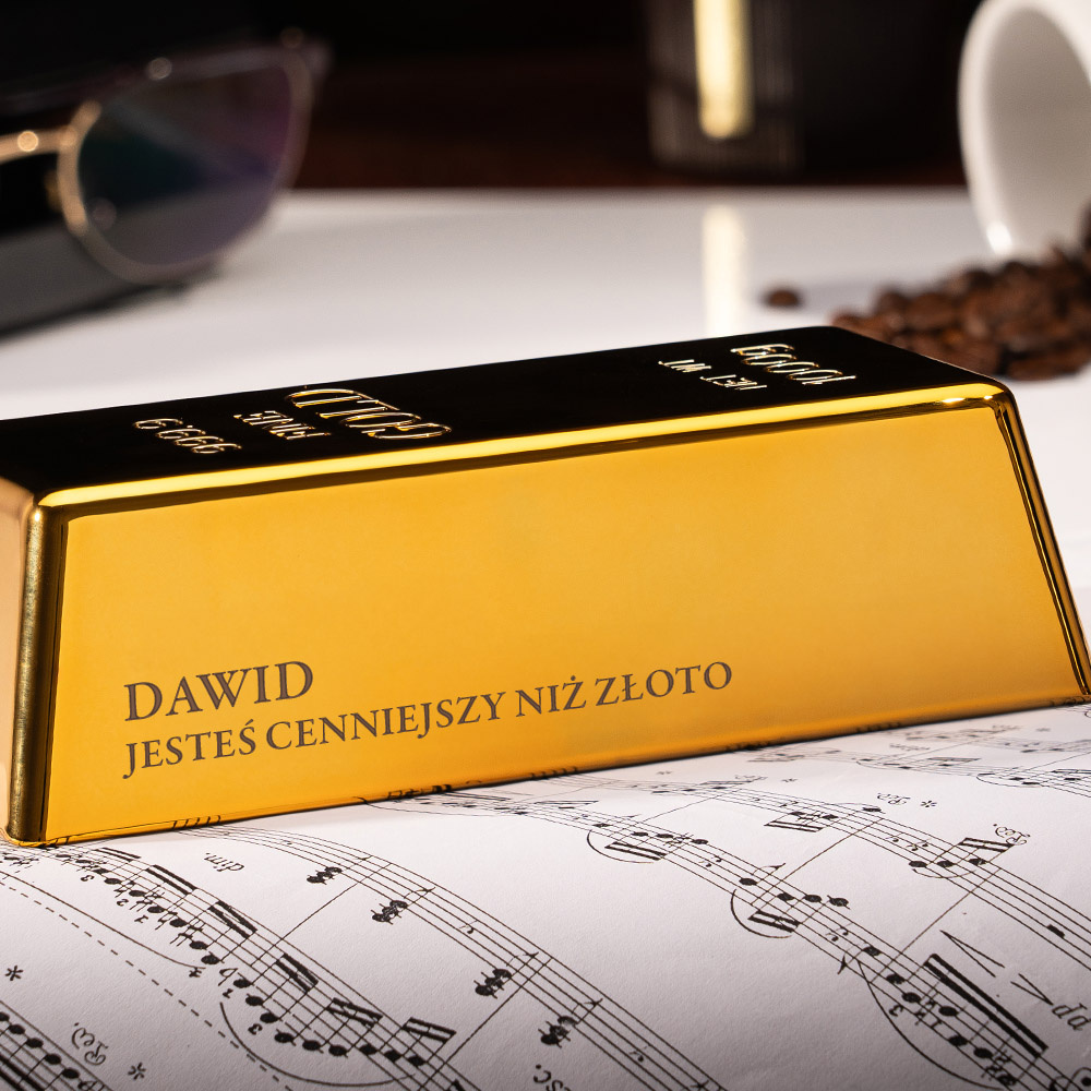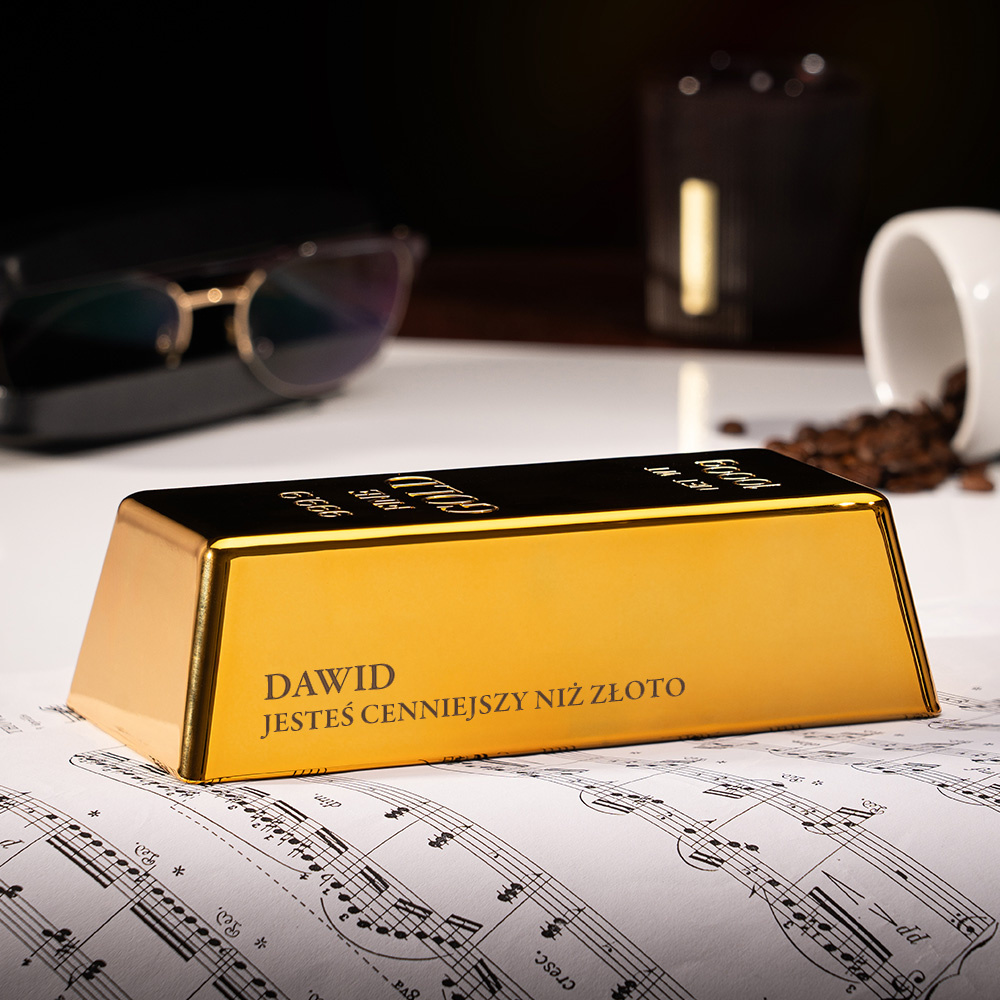 - Elegancka sztabka złota z grawerem imienia i dedykacją „Jesteś cenniejszy niż złoto” to wyjątkowy prezent dla przyjaciela, brata lub pracownika. Symboliczny, stylowy i praktyczny gadżet do domu i biura.