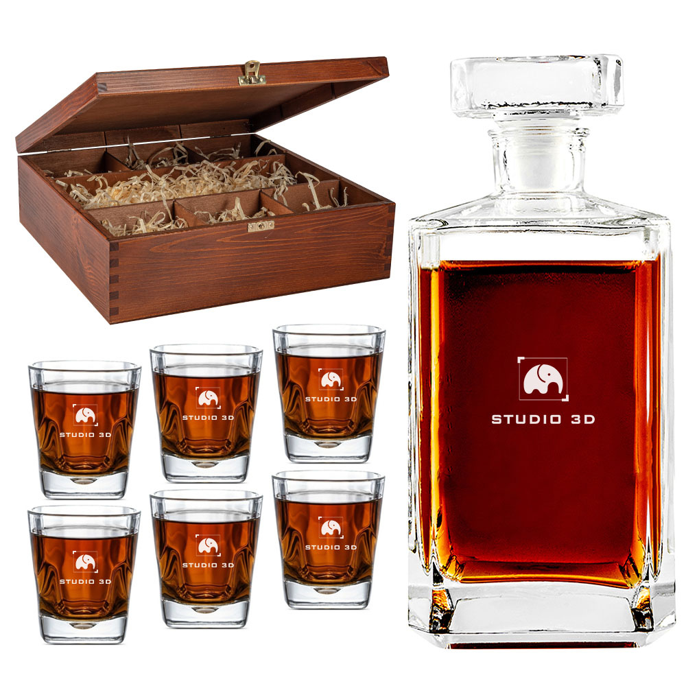 Proponujemy grawerowany zestaw do whisky, koniaku i nalewki na firmowy prezent z okazji Świąt Bożego Narodzenia. Każde element zestawu zostanie opatrzony Twoim logiem firmowym metodą grawerunku laserowego.