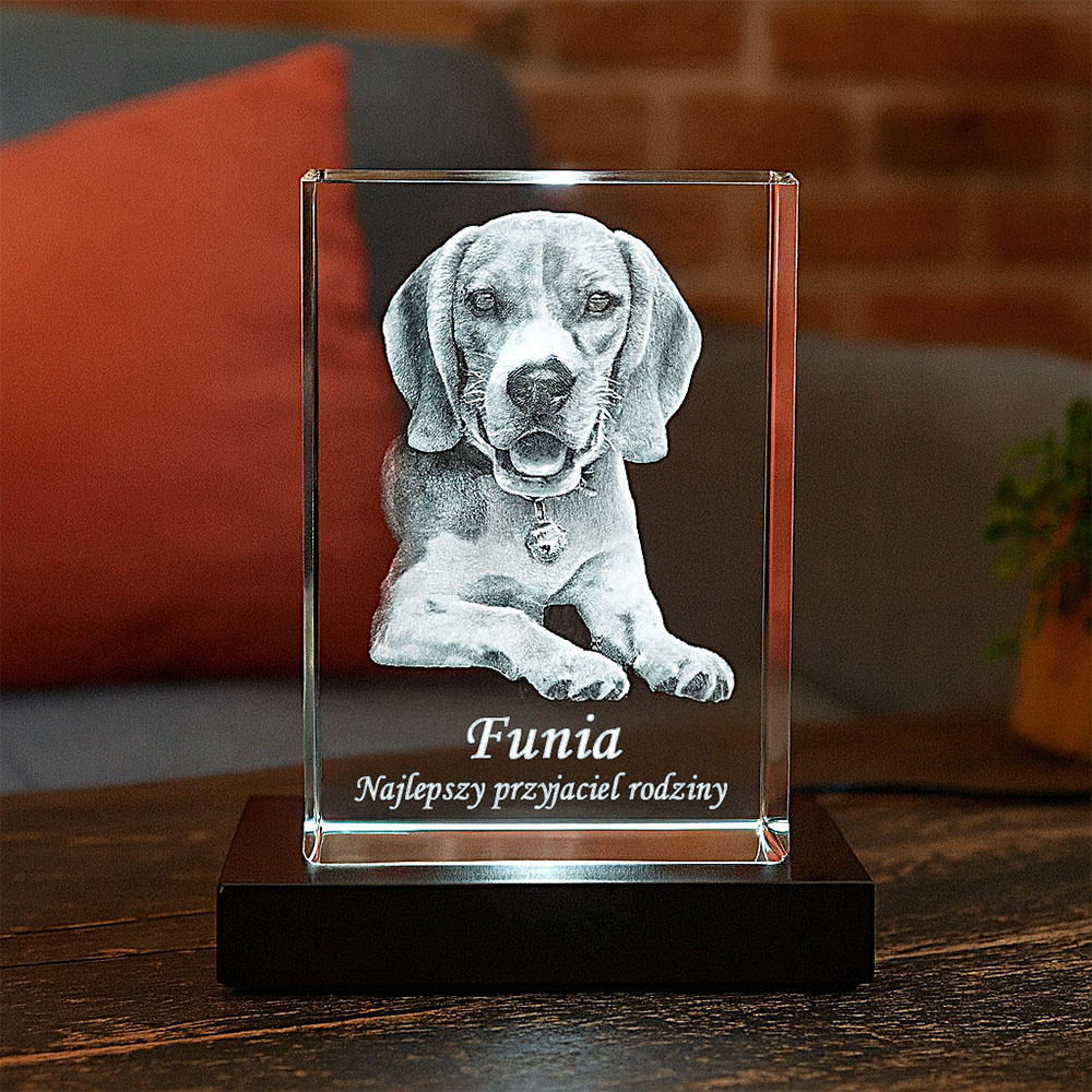- Profesjonalnie wykonany grawer 3D Twojego psa w szkle kryształowym. Statuetka z podświetleniem LED tworzy efektowną fotolampkę, idealną do domu lub biura.