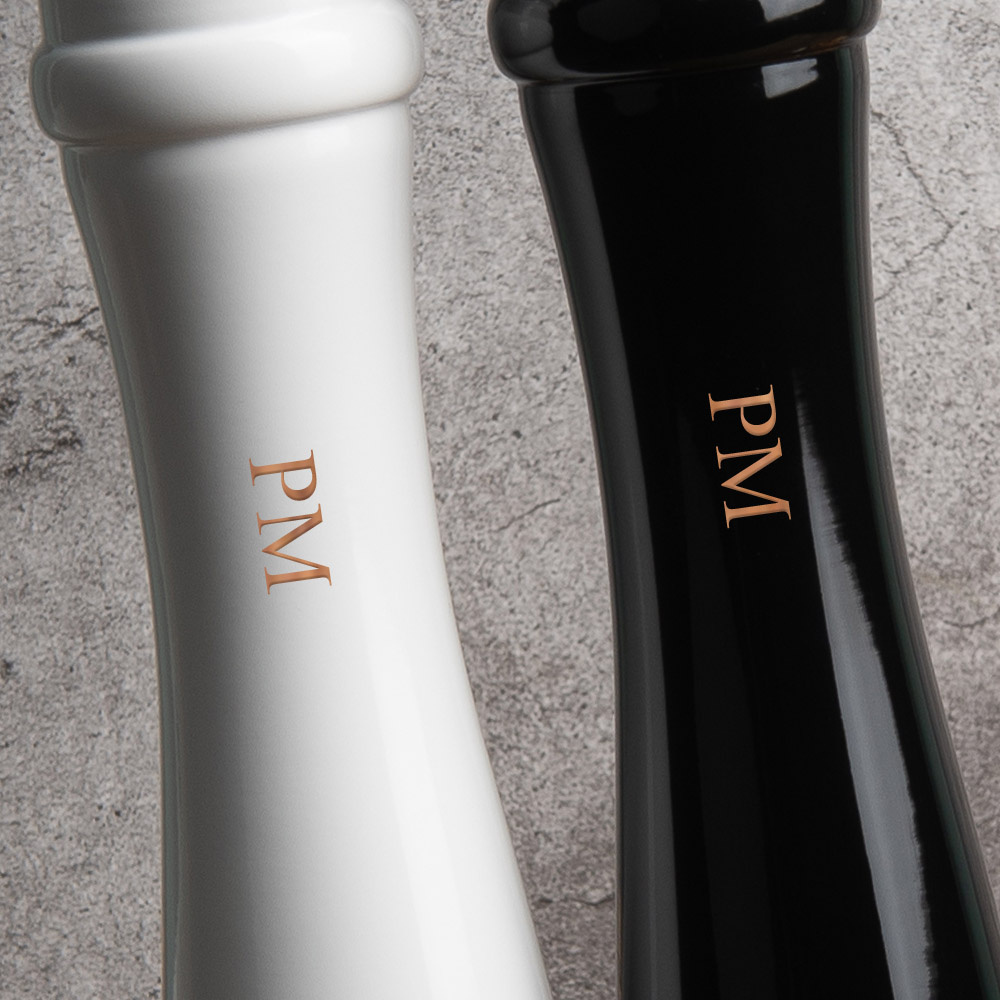 - Bardzo duże młynki do soli i pieprzu, które robi wrażenie. Inicjały grawerowane u podstawy młynków.