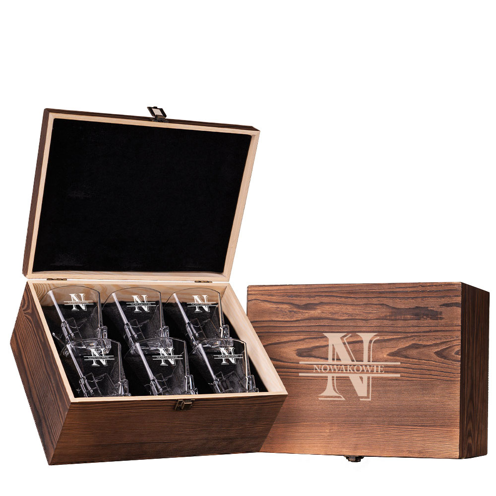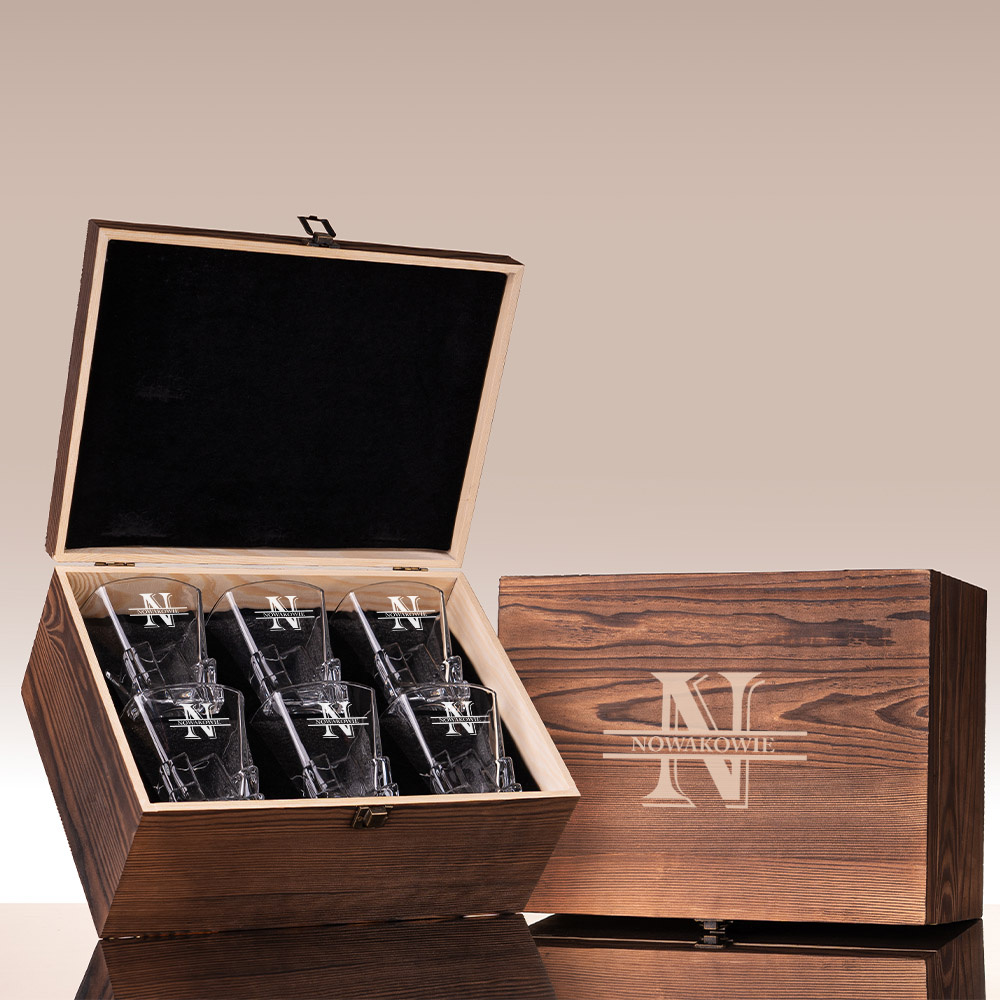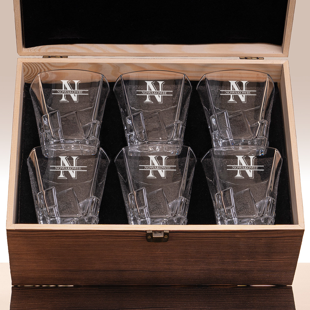 - Ekskluzywny zestaw 6 szklanek lodowych z grawerem monogramu i nazwiska. Zapakowany w drewniane pudełko z personalizacją. To wyjątkowy prezent dla pary – na ślub, rocznicę lub parapetówkę.
