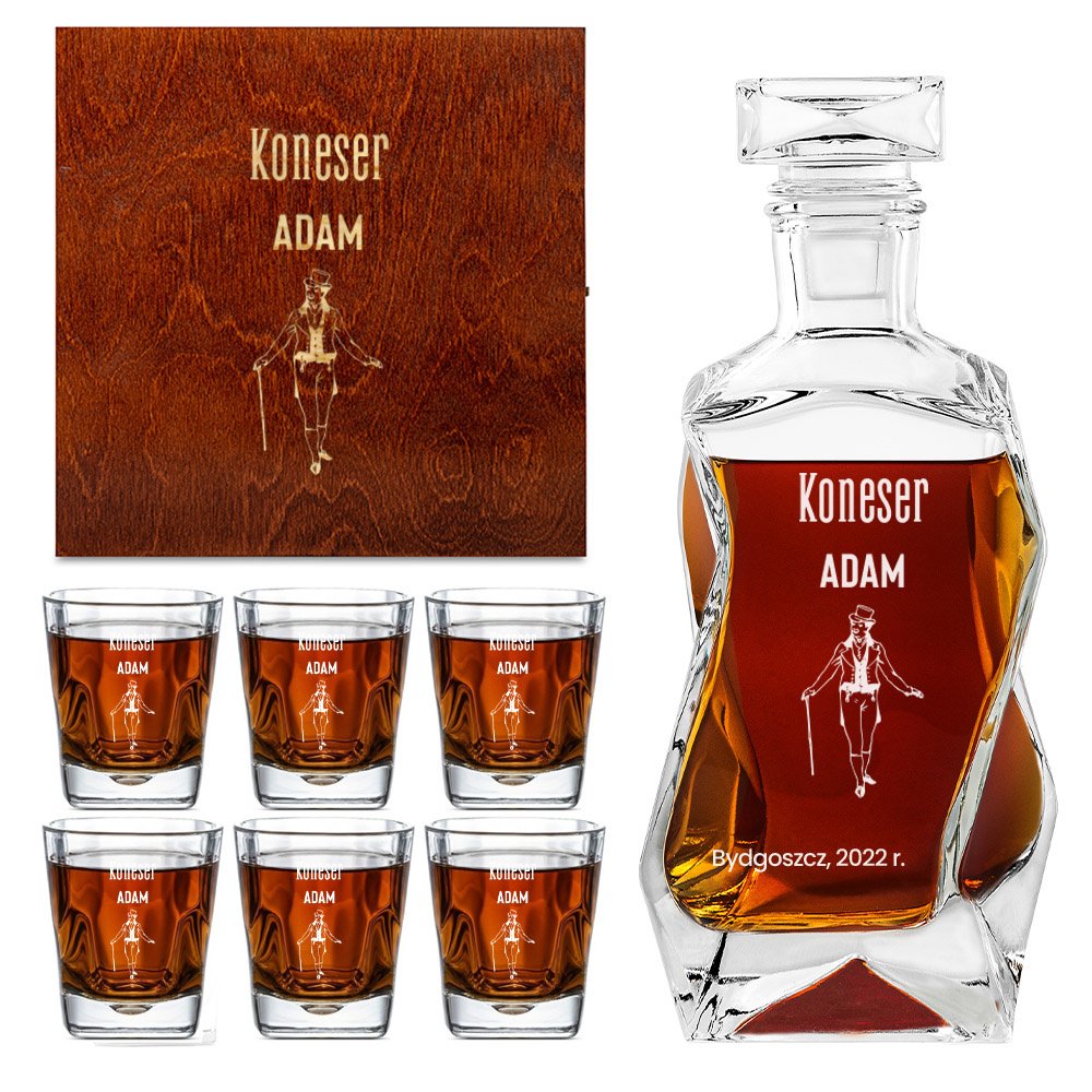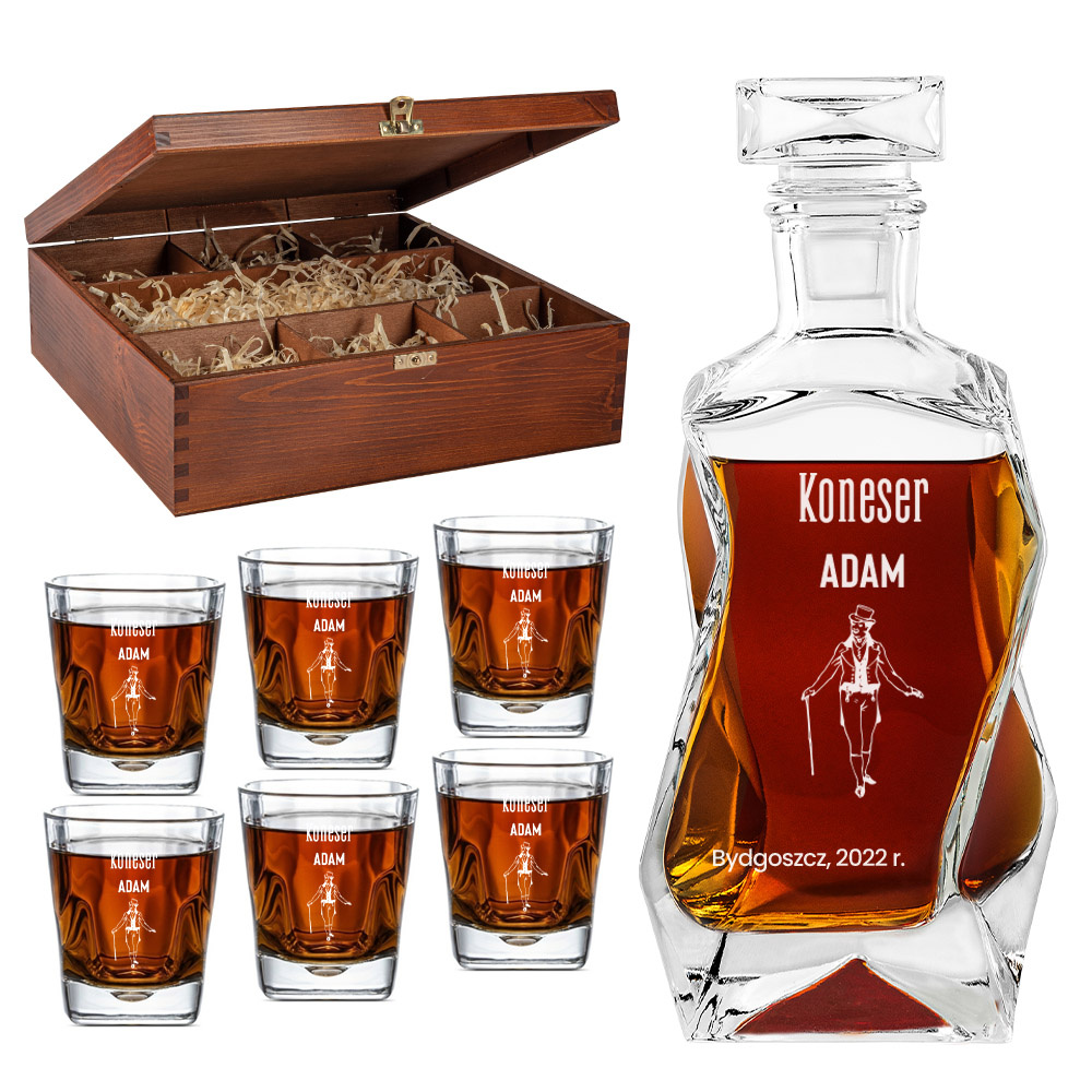 - Ciekawy pomysł na prezent z okazji urodzin lub imienin dla konesera whisky, jakim jest ten okazały zestaw do wina z sześcioma szklankami i łamaną karafką w drewnianym etui z grawerem "KONESER" + IMIĘ.