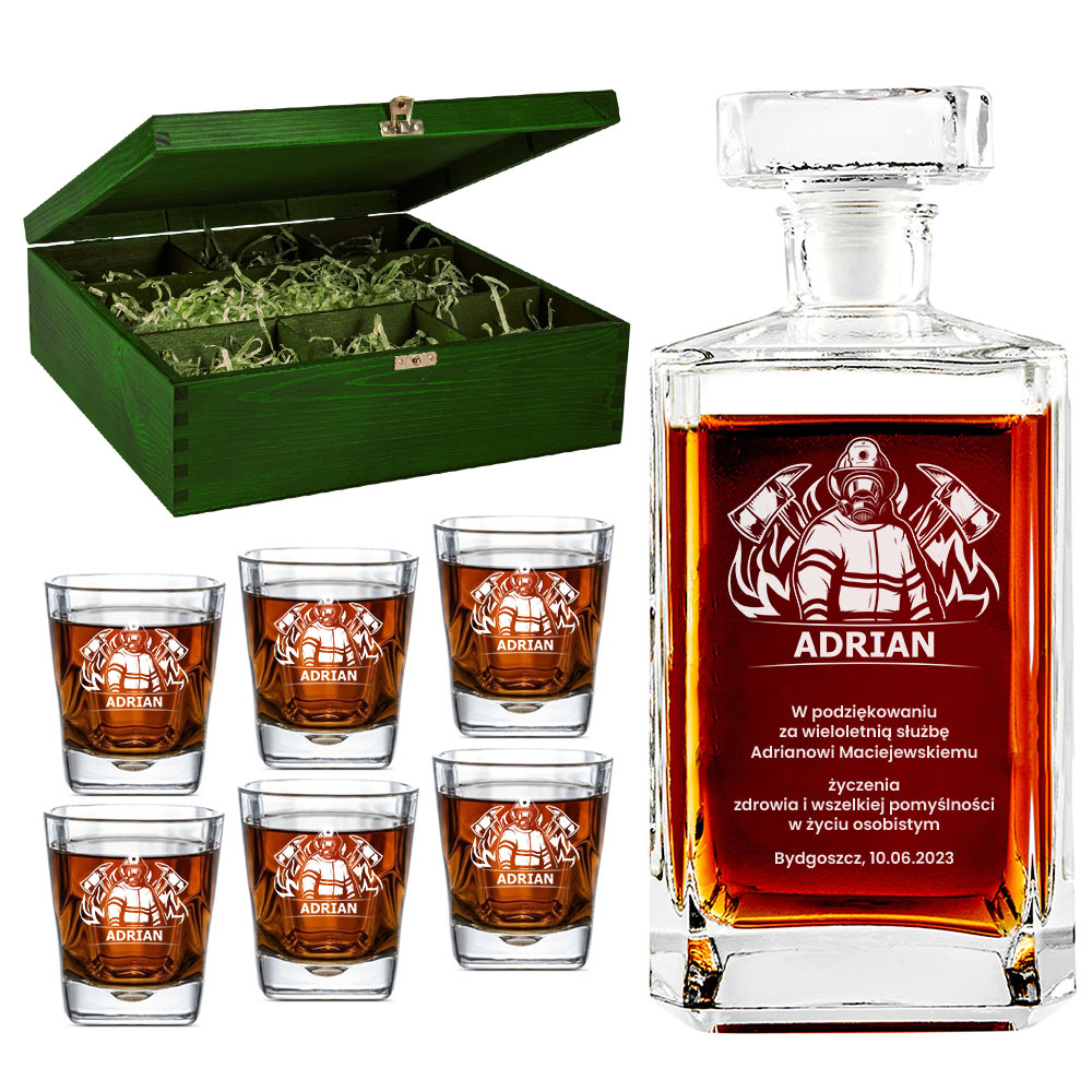 • Zestaw do nalewek i whisky – karafka oraz 6 szklanek w eleganckiej drewnianej, zielonej skrzynce. Wyjątkowy upominek, który świetnie sprawdzi się na różne okazje, takie jak jubileusz, emerytura czy Dzień Strażaka.