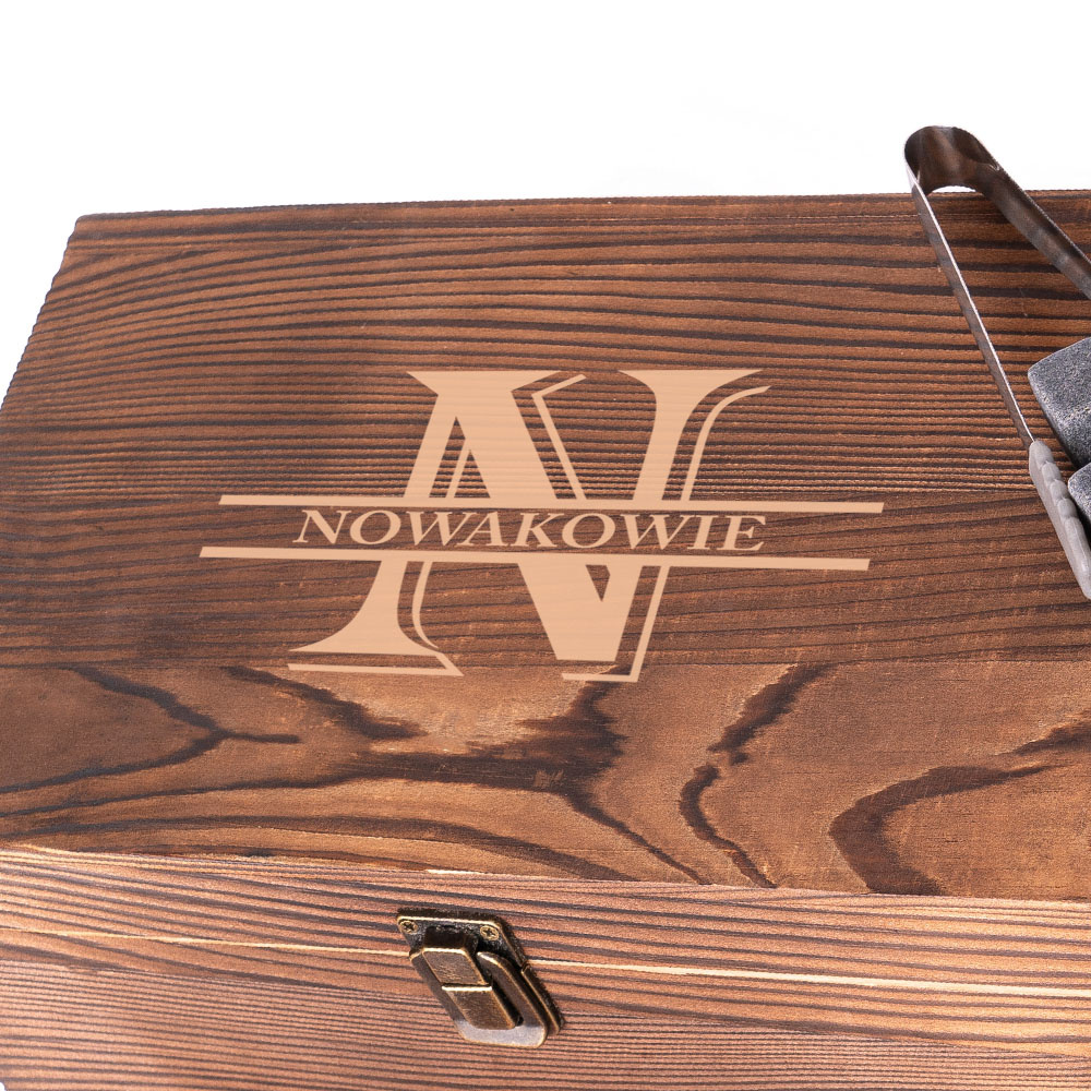 Stylowy prezent dla pary, który zachwyca formą i osobistym akcentem. Drewniana skrzynka z laserowym grawerem – monogramem i wspólnym nazwiskiem – skrywa w środku 2 szklanki TWIST, 8 granitowych kamieni chłodzących oraz eleganckie szczypce.