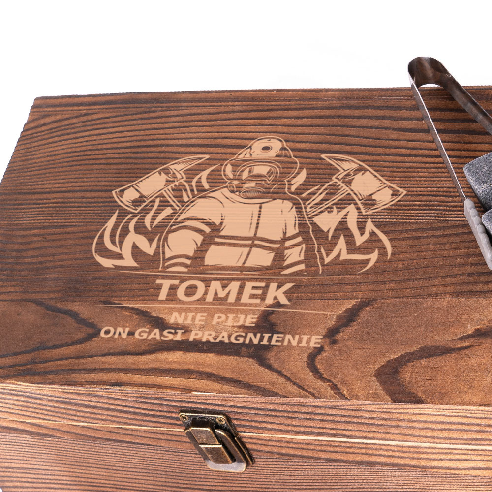 - Zestaw do whisky dla strażaka z grawerem „On nie pije – on gasi pragnienie”. Szklanki TWIST, granitowe kamienie i szczypce w eleganckiej, drewnianej skrzynce z humorem.