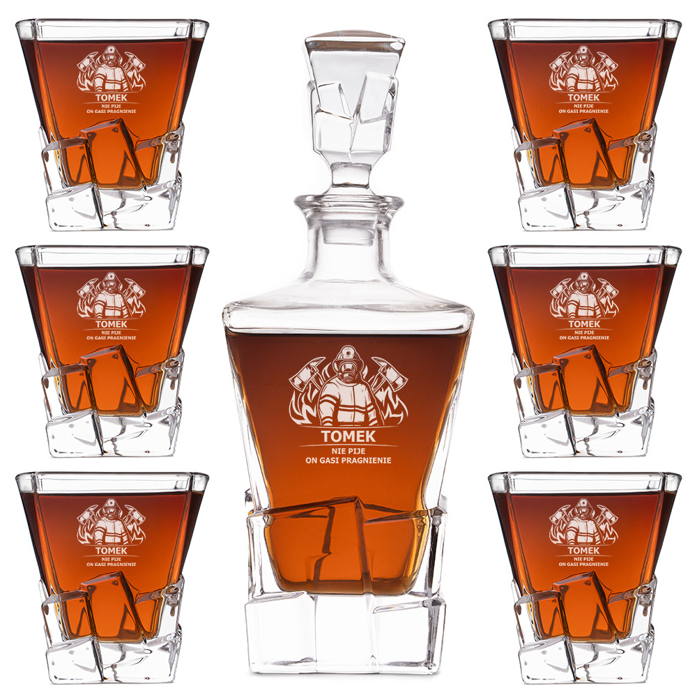 - Stylowy zestaw do whisky dla strażaka z karafką i sześcioma szklankami, ozdobiony grawerem „On nie pije, On gasi pragnienie” oraz imieniem. Pomysłowy prezent z charakterem i humorem.