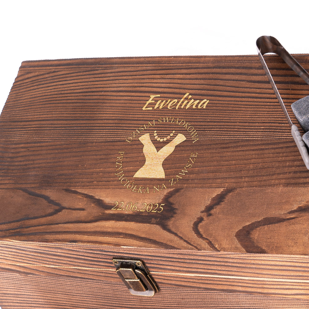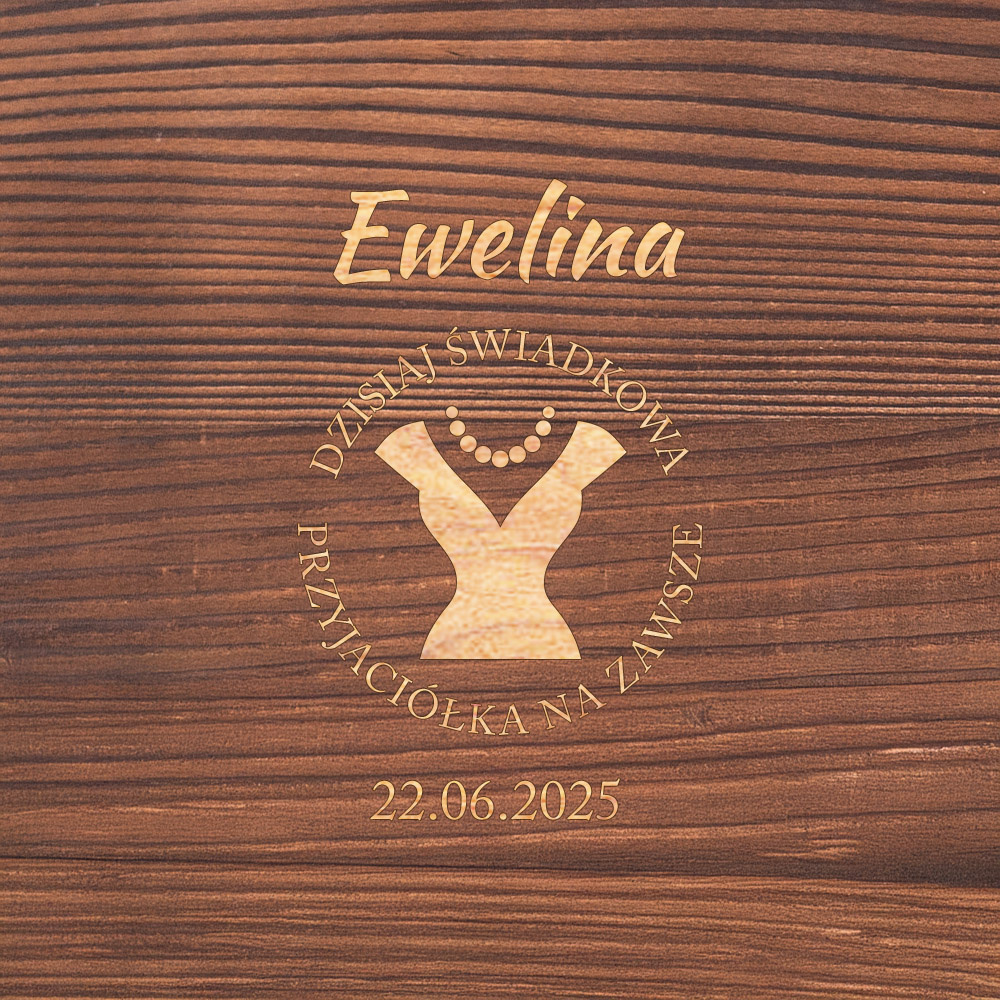 Na wieku skrzynki wykonany jest grawer laserowy z imieniem świadkowej oraz dedykacją, dzięki czemu prezent nabiera osobistego charakteru i staje się symboliczną pamiątką wspólnej przyjaźni.