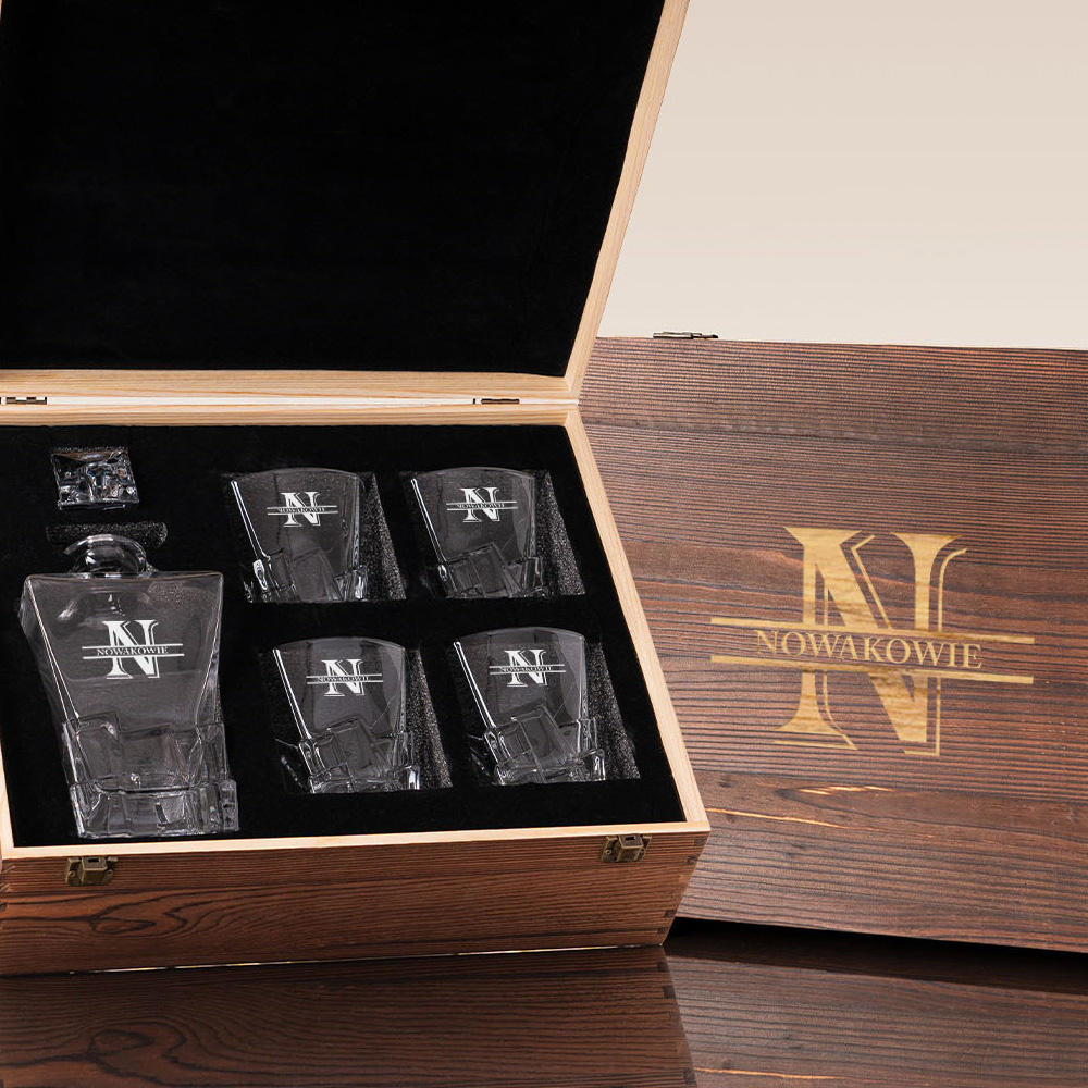 - Ekskluzywny zestaw do whisky dla pary z grawerem monogramu oraz wspólnego nazwiska. Karafka i 4 szklanki w eleganckiej, drewnianej skrzynce – prezent z klasą.