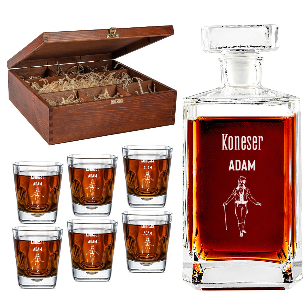 - Stylowy zestaw dla konesera whisky: karafka 0,75 l i 6 szklanek z personalizowanym grawerem, zapakowane w elegancką zieloną skrzynkę. Doskonały prezent pod choinkę.