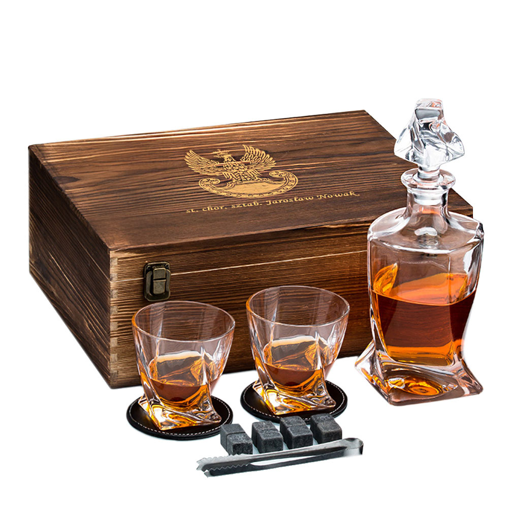 • Elegancki zestaw do whisky dla żołnierza z grawerem orzełka, stopnia i nazwiska w drewnianej skrzynce. Doskonały upominek na awans, emeryturę lub podziękowanie za służbę.