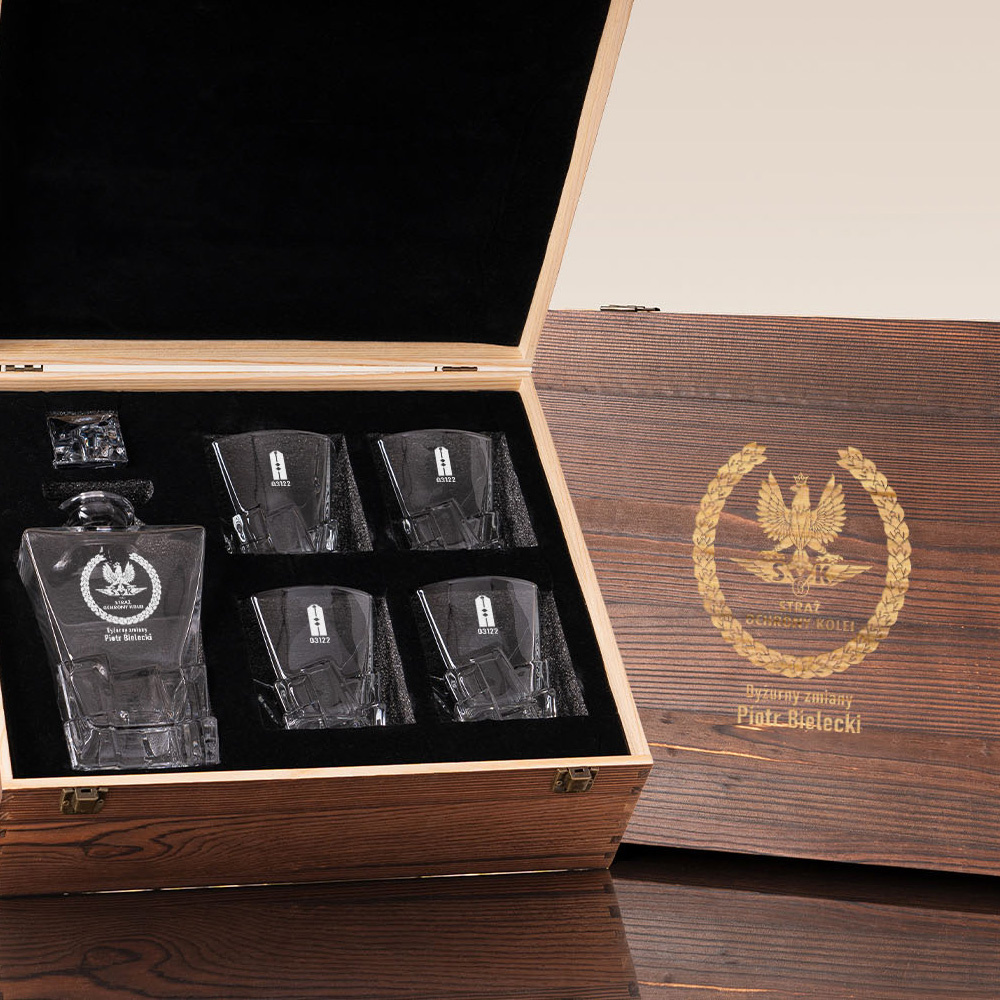 Na szklankach wygrawerowano pagony odpowiednie do stopnia służbowego. Karafka ozdobiona jest emblematem SOK, stanowiskiem oraz imieniem i nazwiskiem funkcjonariusza, a na drewnianej skrzynce umieszczono emblemat Straży Ochrony Kolei. Wszystkie personalizacje wykonano precyzyjnym grawerem laserowym, co zapewnia trwałość i elegancki wygląd.