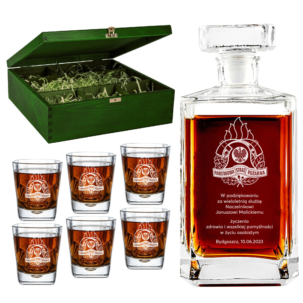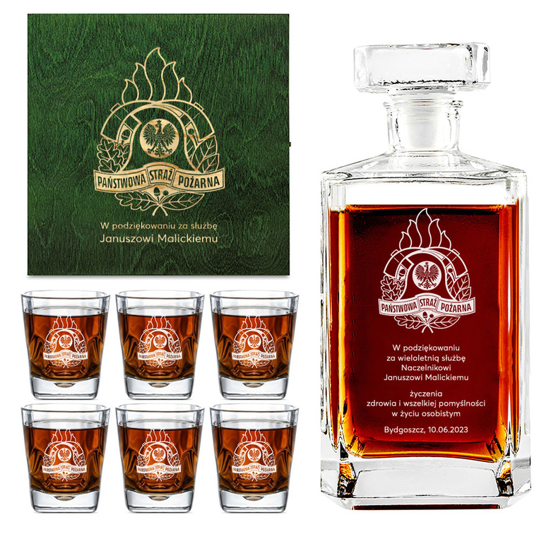 • Elegancki zestaw do whisky, w skład którego wchodzi karafka oraz 6 szklanek, to personalizowany prezent dla strażaka. Całość umieszczona w zielonej skrzynce z wygrawerowanym logo PSP i podziękowaniami za lata pracy. Idealny wybór na prezent na emeryturę.