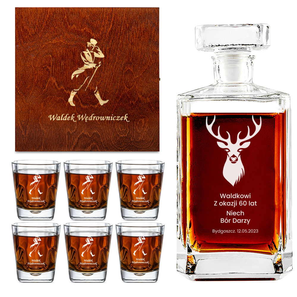 - Ekskluzywny zestaw dla myśliwego amatora whisky. Karafka, 6 szklanek oraz skrzynka z indywidualnym grawerem. Świetny na urodziny i inne okazje. Możesz wpisać tekst jaki sobie życzysz.