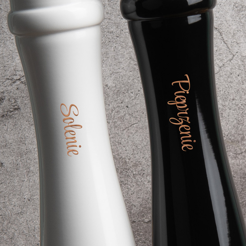 - Zestaw dwóch dużych młynków do soli i pieprzu to oryginalny prezent z grawerem. Biały do soli, czarny do pieprzu. Przeznaczony dla kogoś, kto ceni praktyczność i humor. Wykonane z trwałego drewna kauczukowego, dopełnią każdą kuchnię.