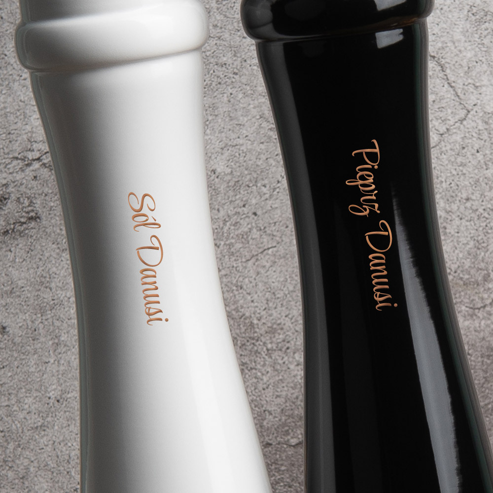 - Elegancki zestaw dwóch młynków do soli i pieprzu, wykonany z drewna kauczukowego i stali nierdzewnej. Biały młynek do soli i czarny do pieprzu z grawerem "Sól + imię" i "Pieprz + imię". Doskonały prezent na każdą okazję dla miłośników gotowania.