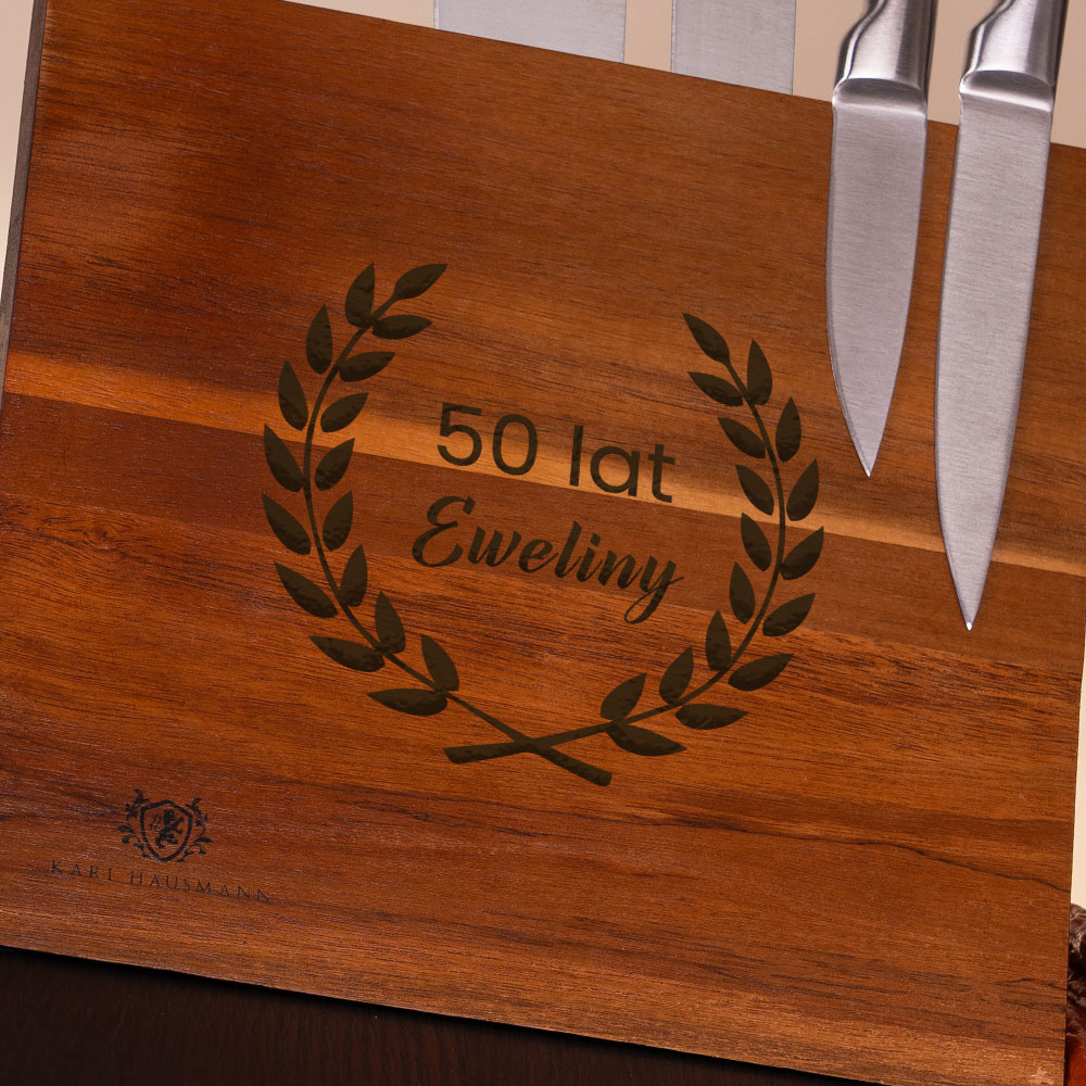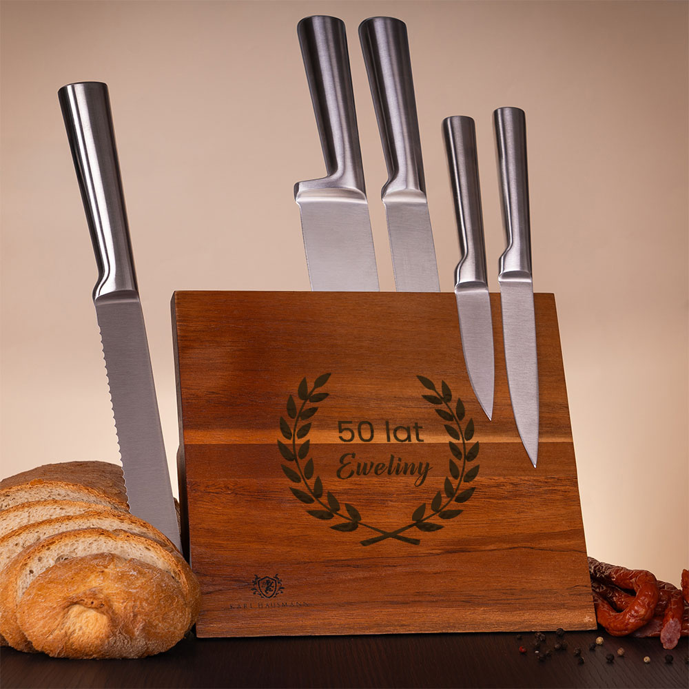 Pięć praktycznych noży ze stali nierdzewnej oraz drewniany blok z grawerem laserowym to prezent, który ucieszy kobietę z okazji 50. urodzin – mamę, siostrę, przyjaciółkę lub koleżankę z pracy. Stylowy wygląd i funkcjonalność sprawiają, że to nie tylko upominek, ale i element codziennej przyjemności w kuchni.