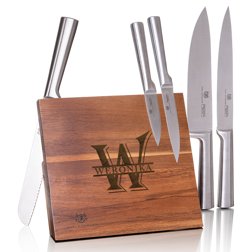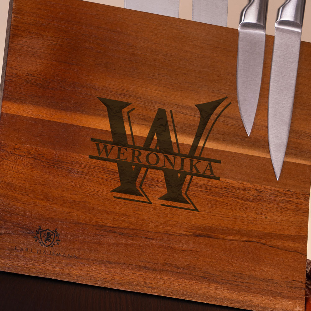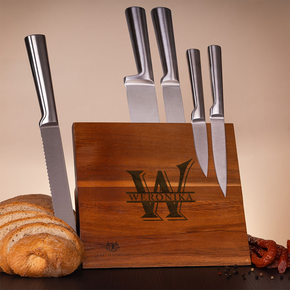 Zestaw 5 noży ze stali nierdzewnej umieszczonych na eleganckim drewnianym bloku z grawerem imienia i inicjału, tworzy zestaw, który zachwyca estetyką i funkcjonalnością. Świetny prezent na urodziny, parapetówkę, rocznicę czy bez okazji – dla niej, która zasługuje na coś wyjątkowego i osobistego.