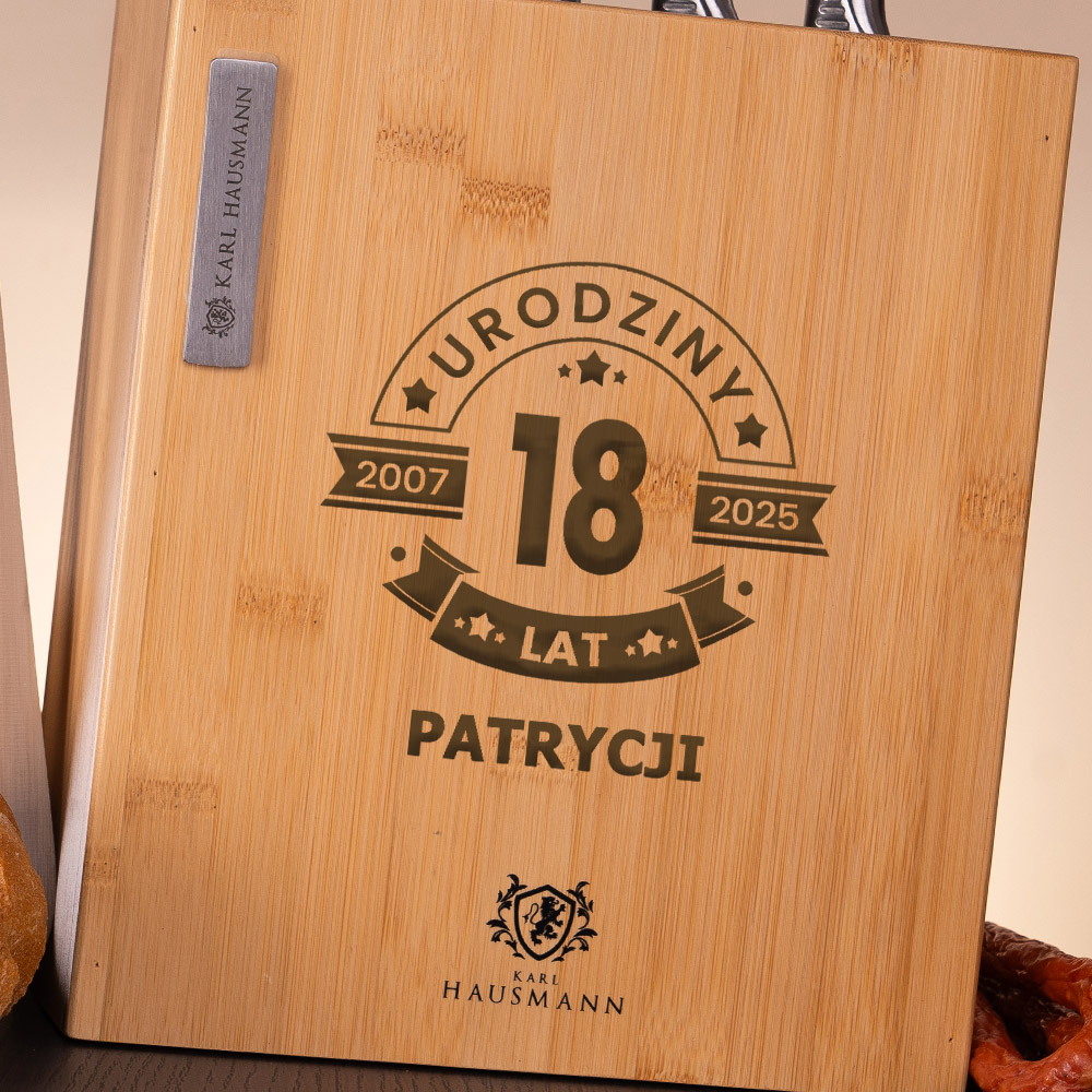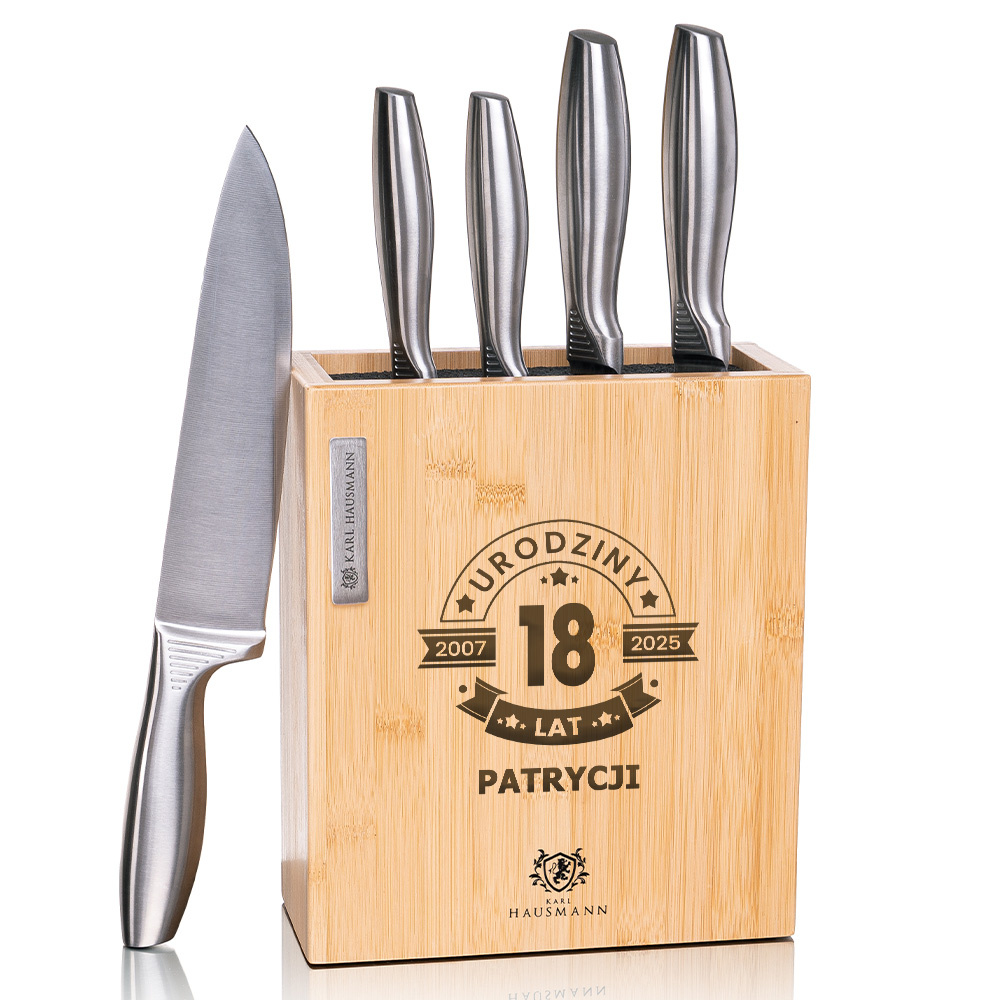 - Zestaw noży kuchennych Karl Hausmann z tematycznym grawerem na 18. urodziny to praktyczny i oryginalny prezent dla dziewczyny. Bambusowy blok z dedykacją doda uroku każdej kuchni.