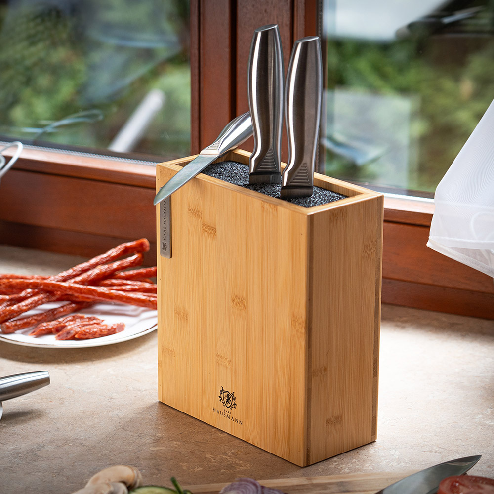 - bambusowa obudowa + wewnątrz sztuczna trawa do lokowania noży