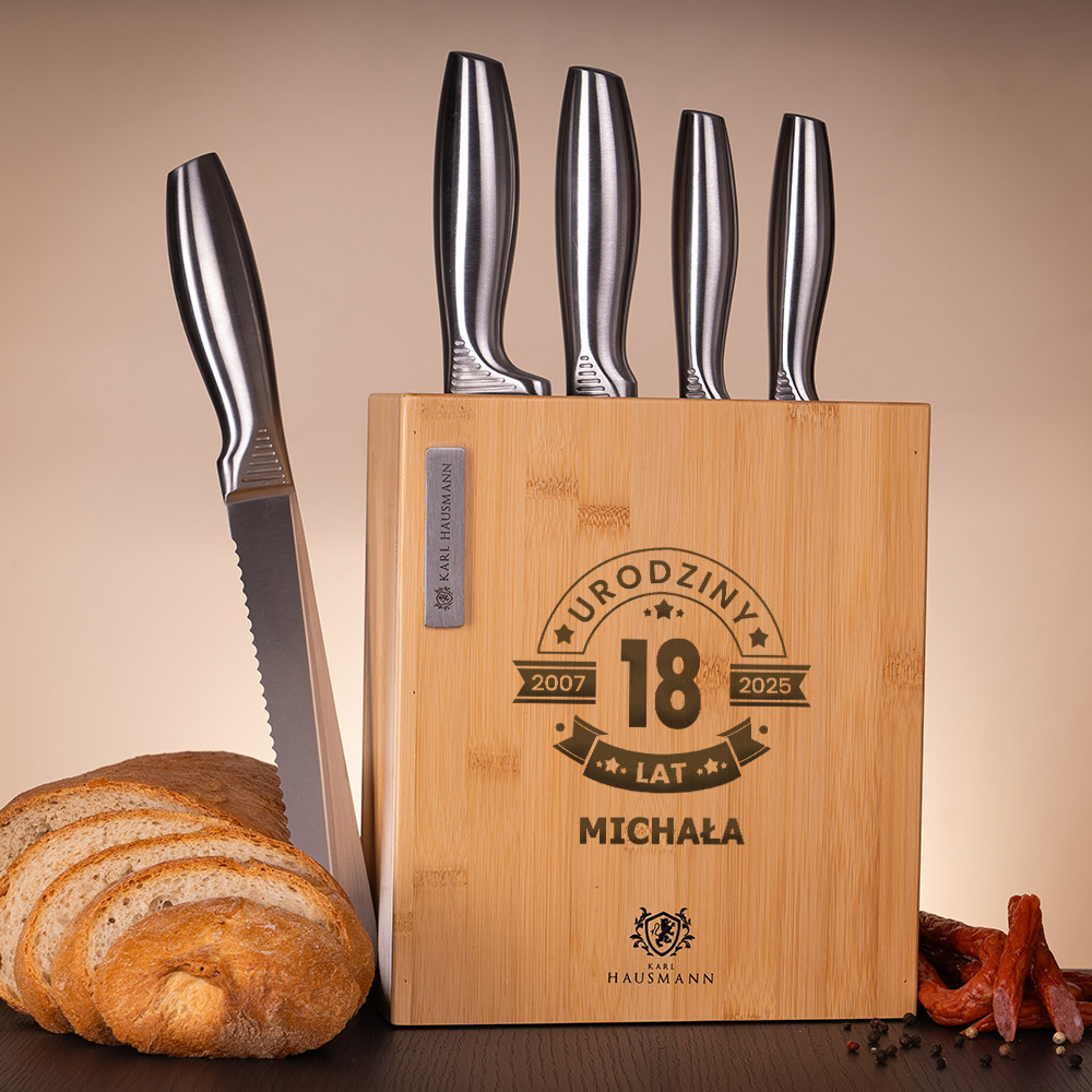 Osiemnaste urodziny to symboliczny krok w dorosłość – dlatego warto podarować coś, co łączy praktyczność z osobistym akcentem. Zestaw 5 noży kuchennych Karl Hausmann z grawerem na bambusowym bloku to funkcjonalny prezent, który zostaje na dłużej.