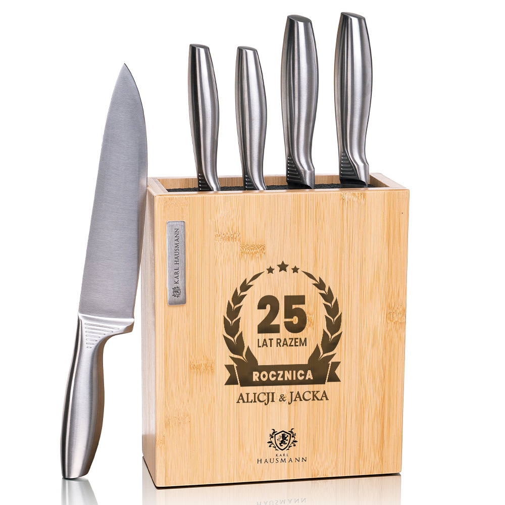 • Zestaw noży kuchennych Karl Hausmann z bambusowym blokiem i grawerem na 25. rocznicę ślubu to wyjątkowy prezent z okazji srebrnych godów – praktyczny, elegancki i z personalizacją.
