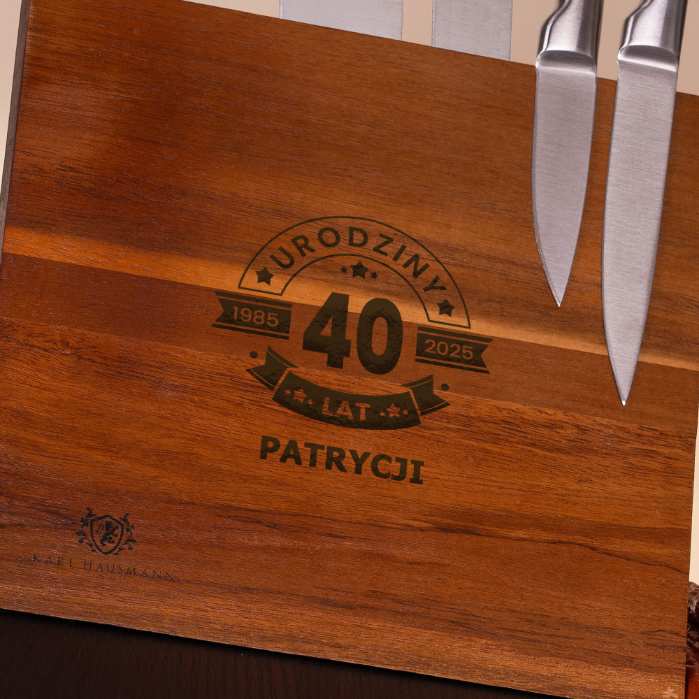 Pięć precyzyjnych ostrzy ze stali nierdzewnej oraz drewniany blok magnetyczny z grawerem laserowym tworzą harmonijną całość – estetyczną i praktyczną. To prezent na 40. urodziny, który będzie codziennie przypominał, że elegancja może iść w parze z funkcjonalnością, a każdy dzień może smakować jeszcze lepiej – dosłownie i metaforycznie.