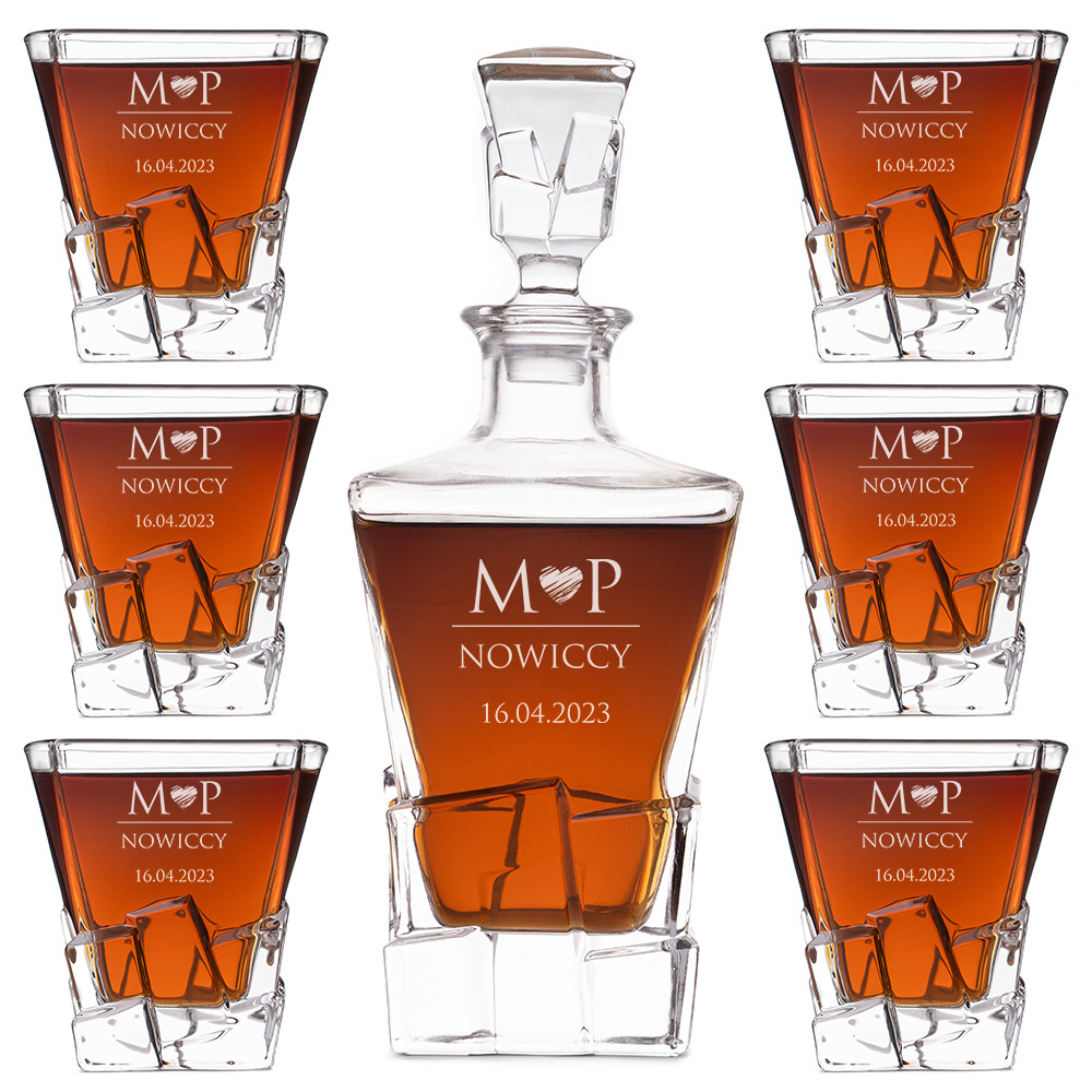 Zaskocz bliskich wyjątkowym upominkiem, który łączy elegancję i personalizację. Zestaw Premium do whisky z grawerem inicjałów, nazwiska i daty to doskonały prezent dla pary z okazji parapetówki, rocznicy ślubu, zaręczyn lub wspólnego jubileuszu. W zestawie znajduje się karafka o pojemności 0,75 l oraz 6 szklanek 0,28 l, wykonanych z grubego, przezroczystego szkła. Na każdym elemencie wygrawerujemy inicjały (np. A&M), nazwisko (np. Kowalscy) oraz symboliczną datę. Dzięki grawerowi laserowemu całość prezentuje się luksusowo i stylowo. To prezent dla pary, który zostanie z nimi na lata – użyteczny, elegancki i pełen emocji.