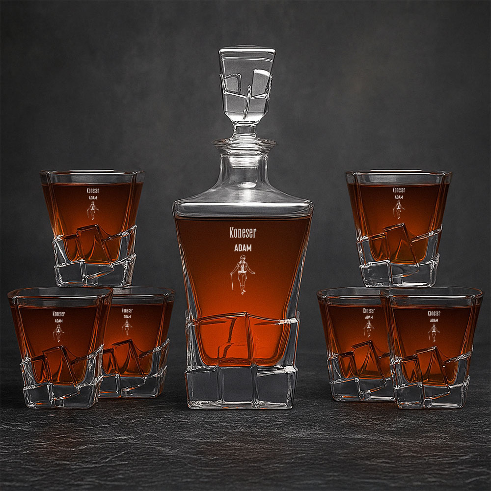 Zestaw stworzony z myślą o prawdziwym znawcy! Ten zestaw Premium do whisky dla konesera to połączenie stylu, jakości i szacunku do tradycji szkockiego trunku. W skład wchodzi karafka 0,75 l oraz 6 szklanek po 0,28 l, wykonanych z grubego, przezroczystego szkła klasy premium. Na każdym elemencie znajduje się precyzyjny grawer laserowy – imię obdarowanego oraz wizerunek Jasia Wędrowniczka, symbolicznego gentlemana i miłośnika whisky. To znakomity prezent dla konesera szkockiej whisky, który ceni nie tylko smak, ale i rytuał serwowania. Doskonale sprawdzi się na urodziny, jubileusz, awans lub jako prestiżowy upominek dla pasjonata. Ten zestaw mówi jedno: „Tu nalewa się z klasą”.