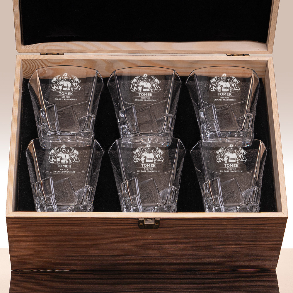 • Zestaw 6 szklanek dla strażaka z grawerem postaci w hełmie i napisem: „On nie pije – on gasi pragnienie”. Humorystyczny prezent w eleganckiej formie – dla bohatera z poczuciem humoru!