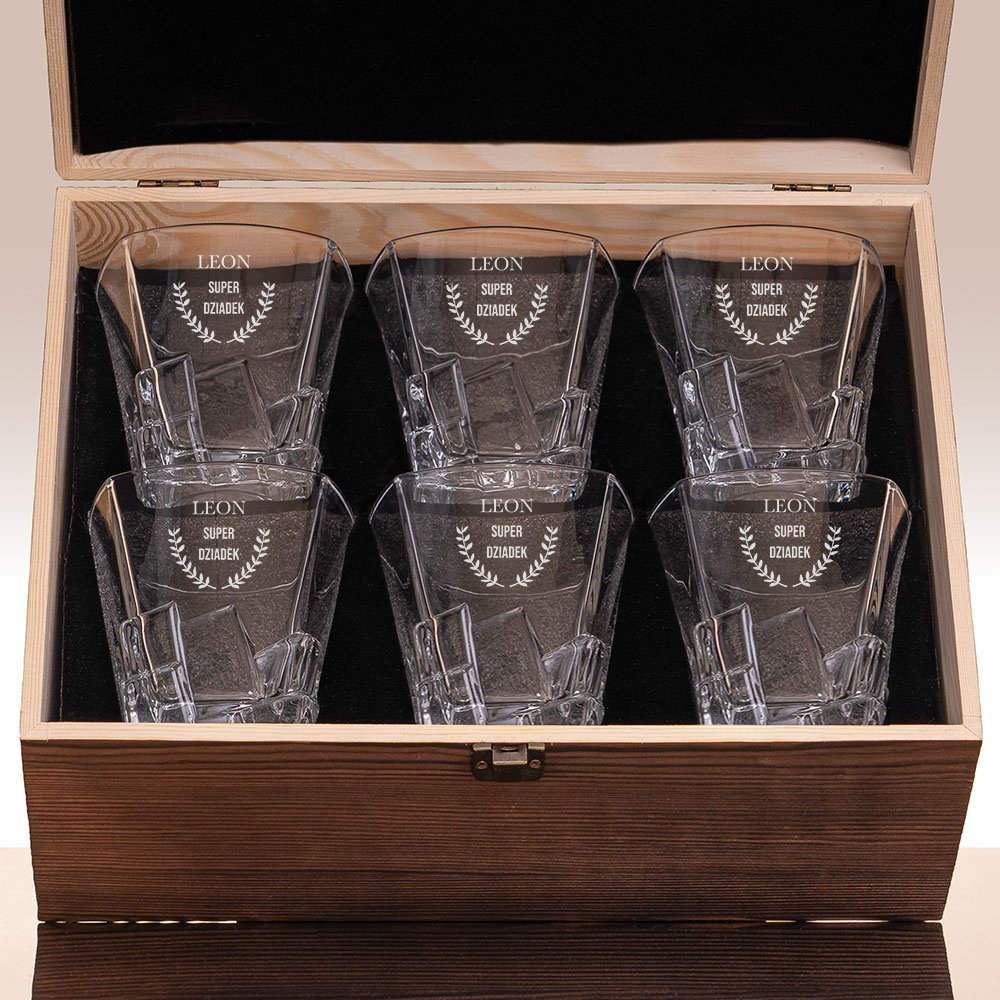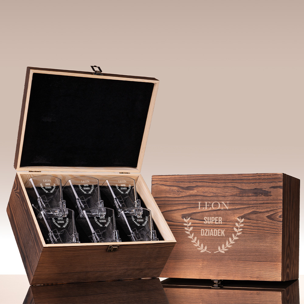 Całość umieszczona jest w drewnianej skrzynce, w której szklanki leżą bezpiecznie w czarnej, eleganckiej piance. To idealny prezent na Dzień Dziadka, urodziny lub po prostu wyraz wdzięczności za miłość i opiekę.