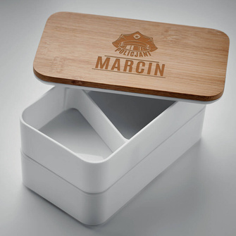 Lunch box biały z bambusową pokrywką GRAWEROWANY MONOGRAM